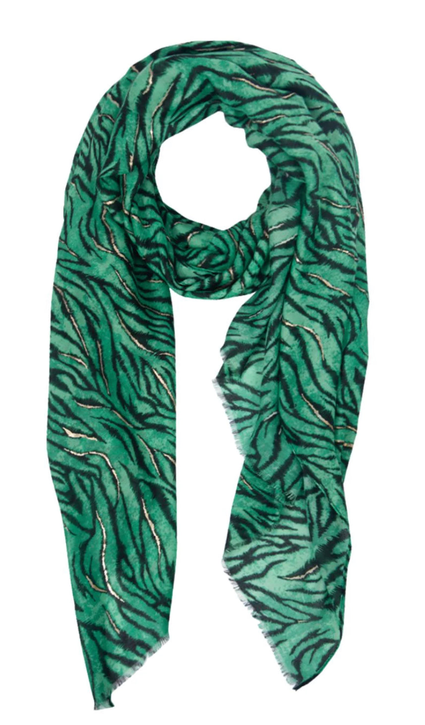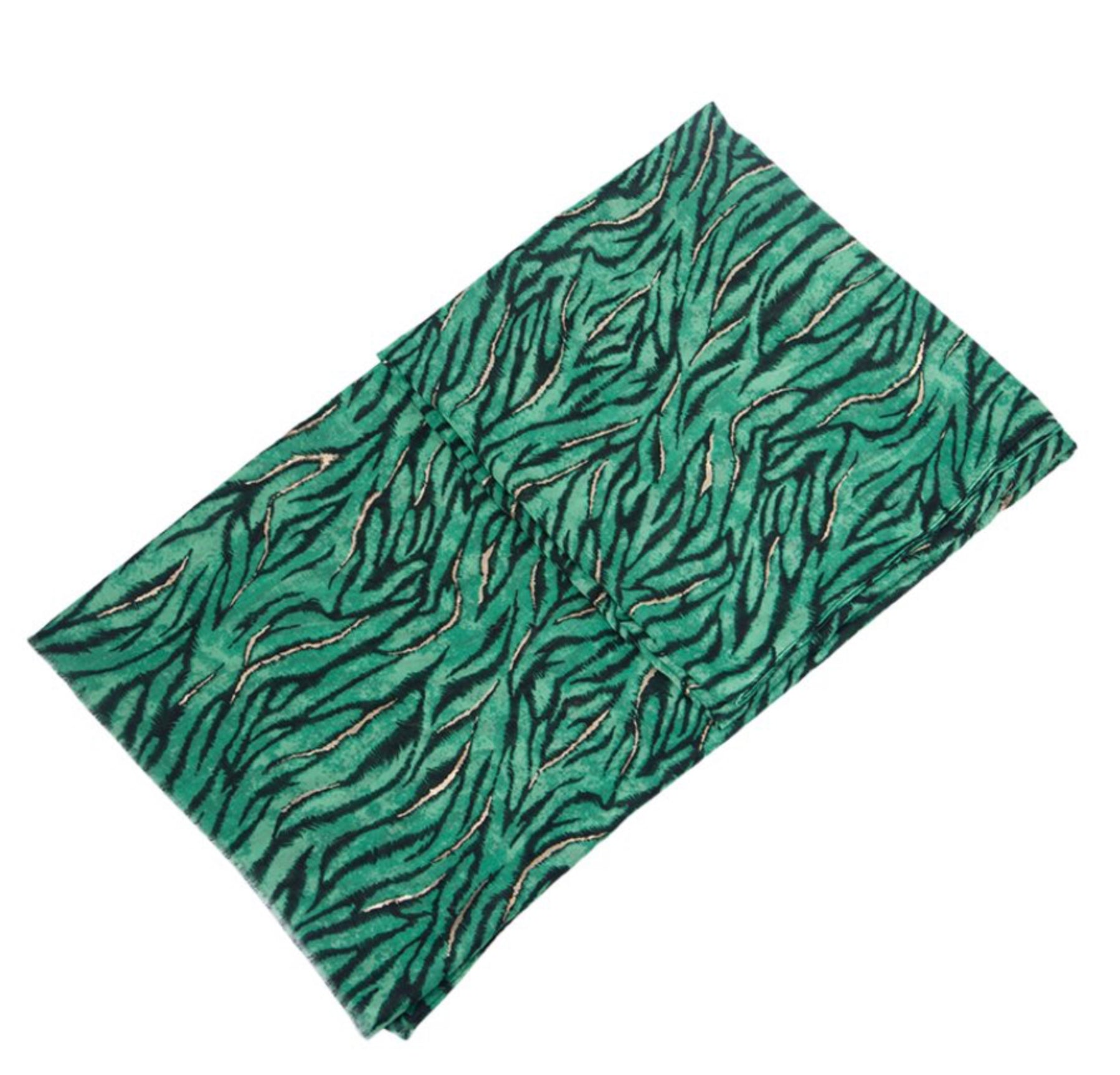 Add a touch of shimmer and statement style to your outfit with this green animal print foil scarf, designed to elevate both everyday and occasion looks. Featuring a striking animal print pattern enhanced with subtle foil accents, this scarf brings texture, depth, and a soft glow to your accessories collection.