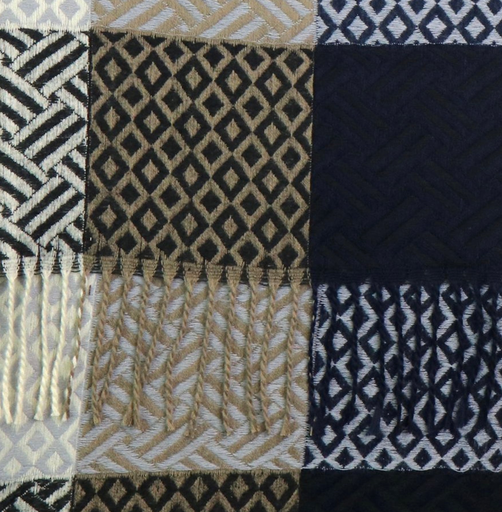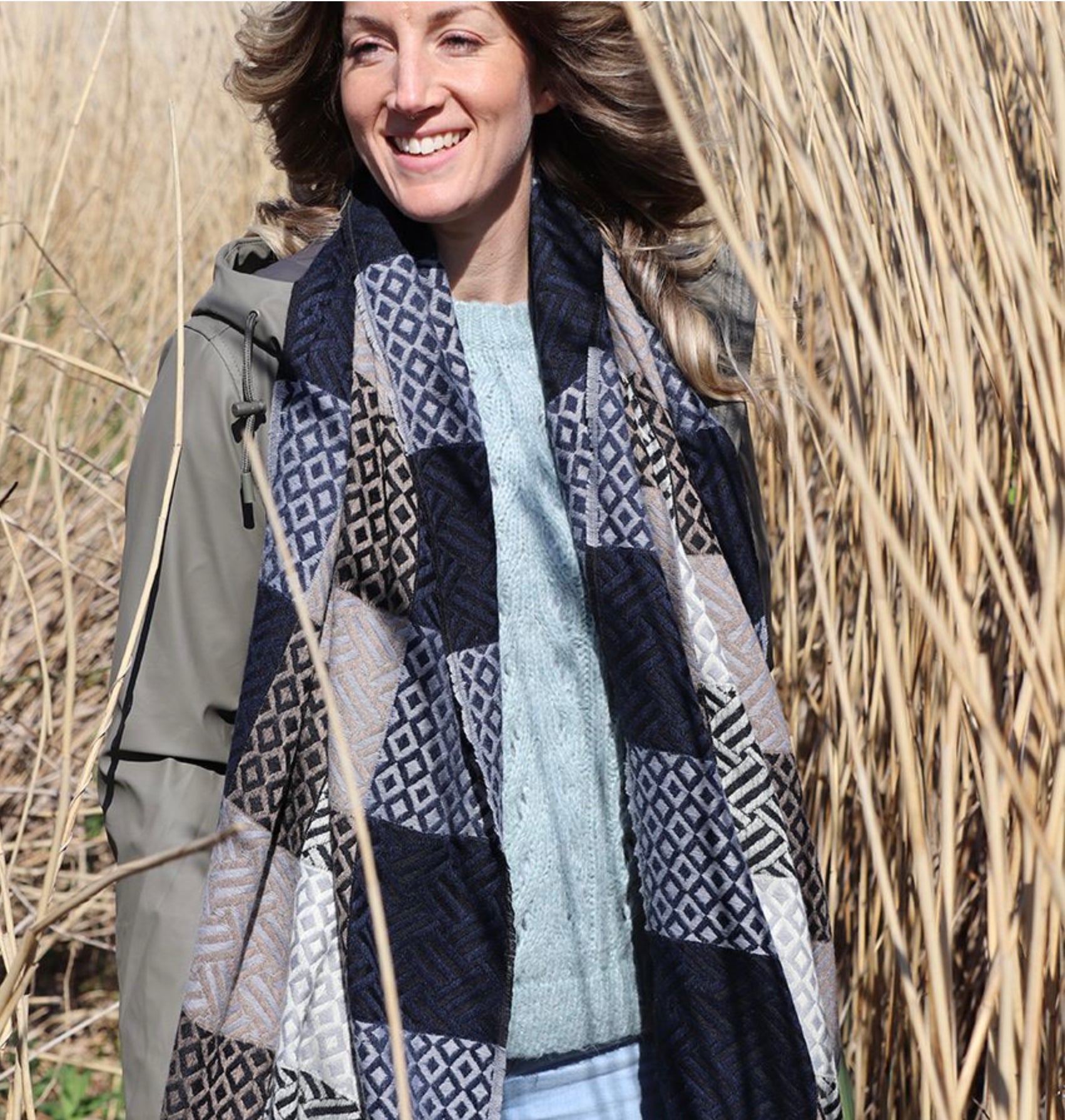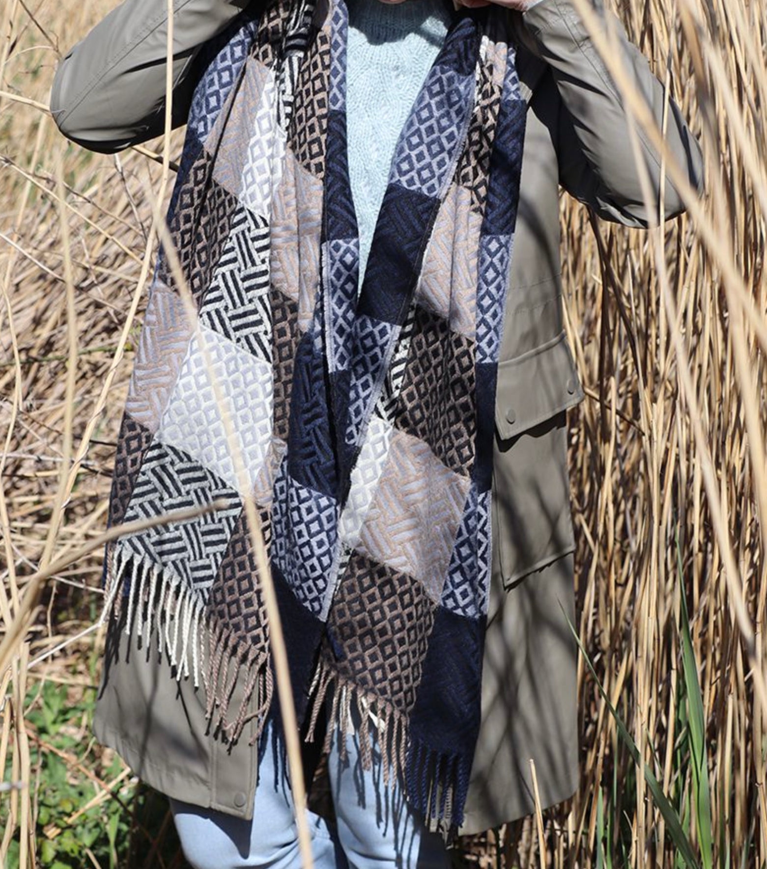 Warm scarf with a geometric tile effect weave in dark blue denim blue, mid grey, cream and taupe, finished with twist tassels at each end