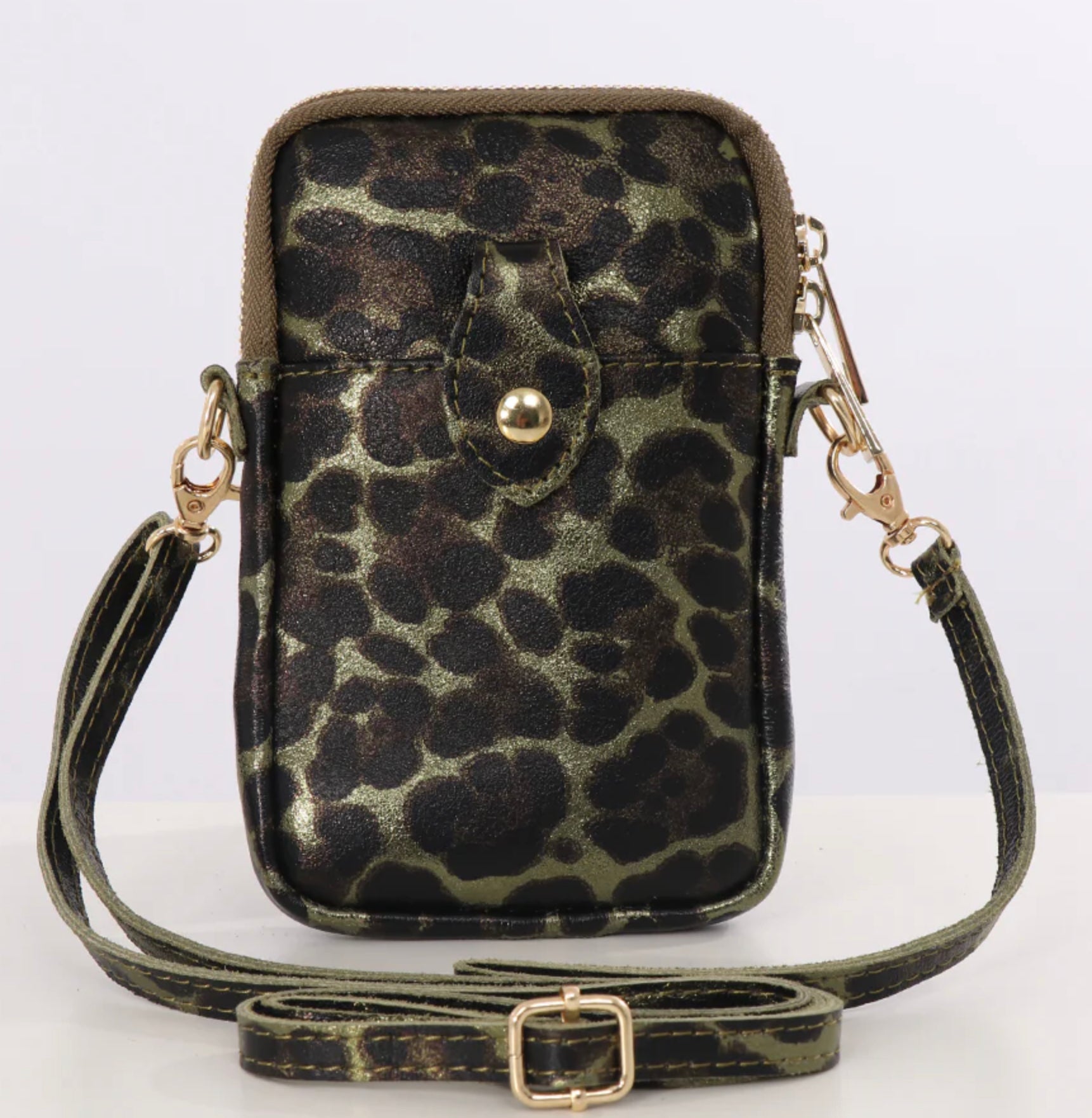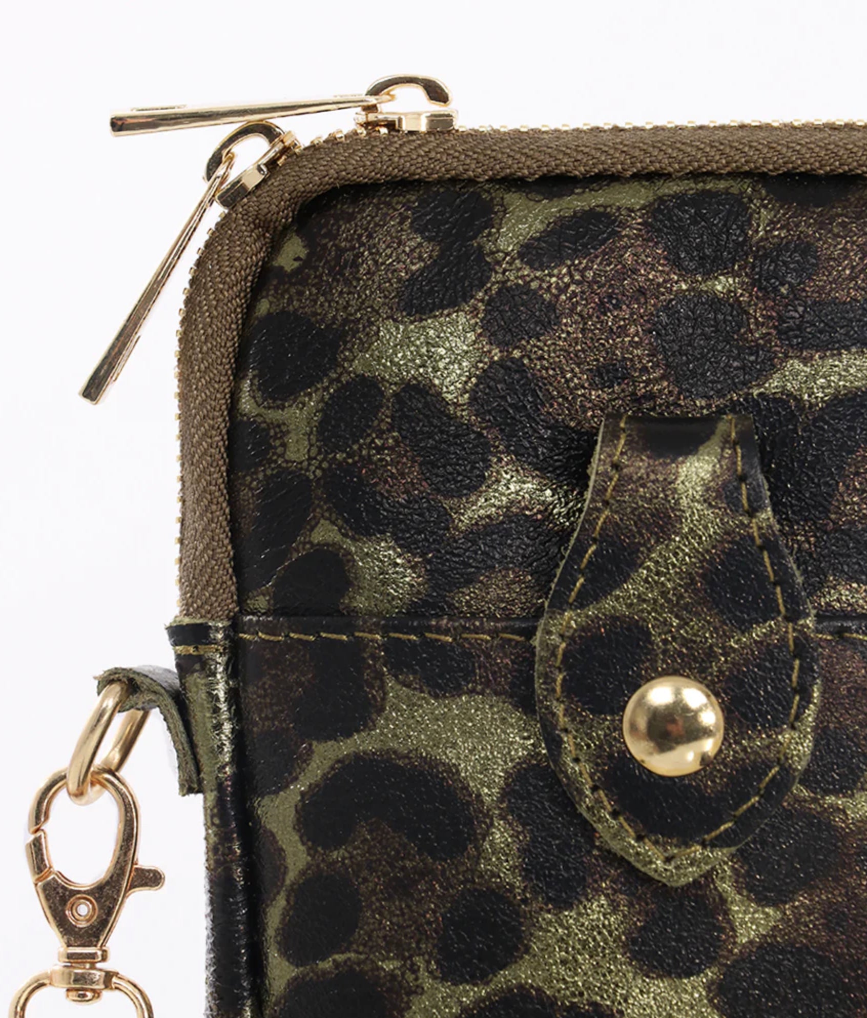 Khaki Leopard Print Leather Crossbody Phone Bag