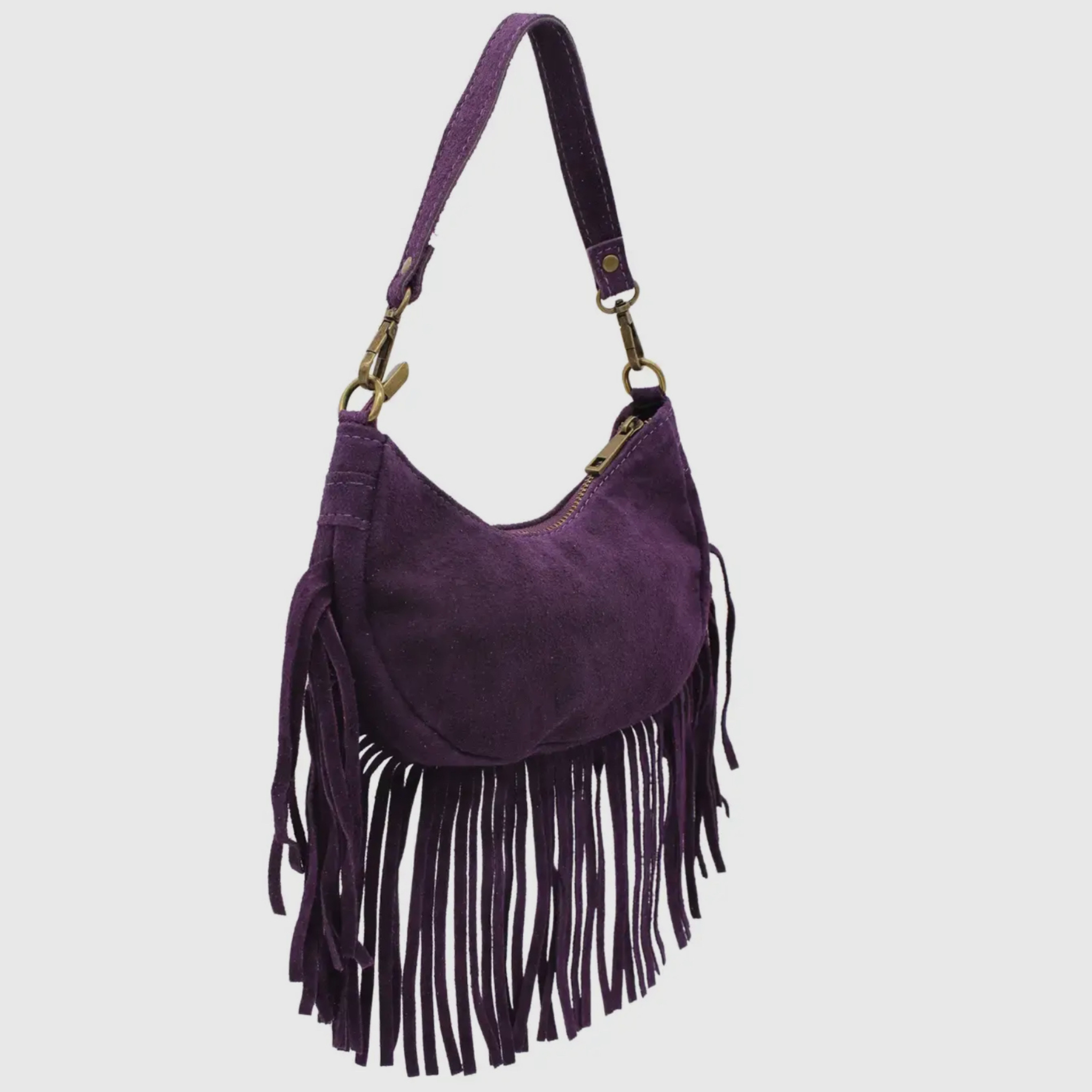 Add effortless bohemian elegance to your accessories collection with the Lola purple genuine Italian suede fringed crossbody bag, crafted from soft, luxurious suede for a refined yet relaxed finish. Designed for versatility, it can be worn as a crossbody or shoulder bag thanks to its adjustable, detachable strap, making it ideal for everyday wear, casual outings, or travel.