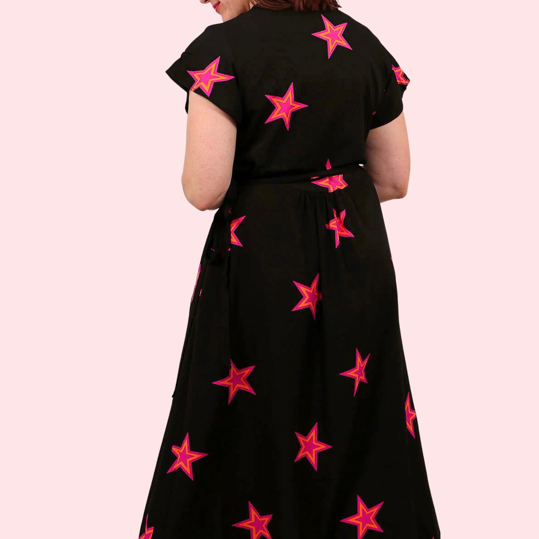 Rosa - Black Star Midi Wrap Dress A stunning black midi dress with a pop of colour and star outline design. The dress wraps around and fastens with a waist tie. A flattering V neck line and short cuffed sleeves.  Perfect occasional dress for day or evening  Material: 100% Viscose