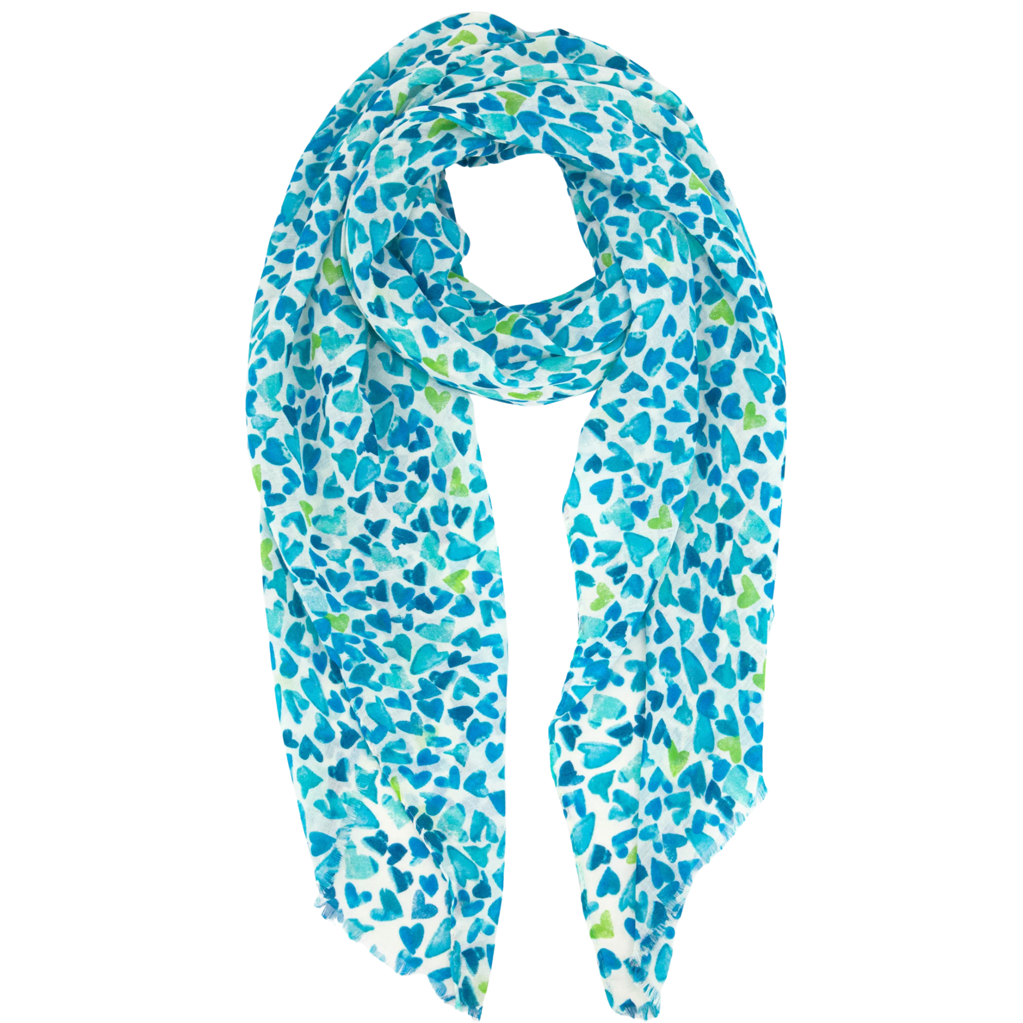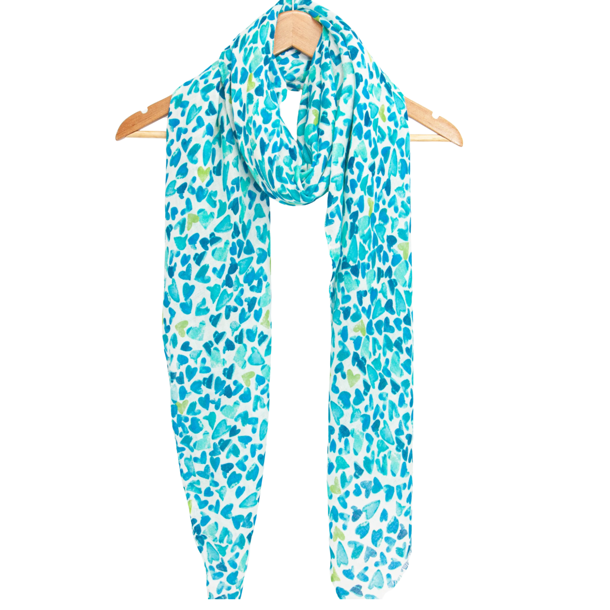 Finished with delicate fringed edges and a generous 180cm x 90cm size, it can be styled as a wrap, shawl, or classic neck scarf. The charming hand-drawn heart design in calming blue tones makes it an ideal accessory for casual outfits, special occasions, or a thoughtful gift for her.