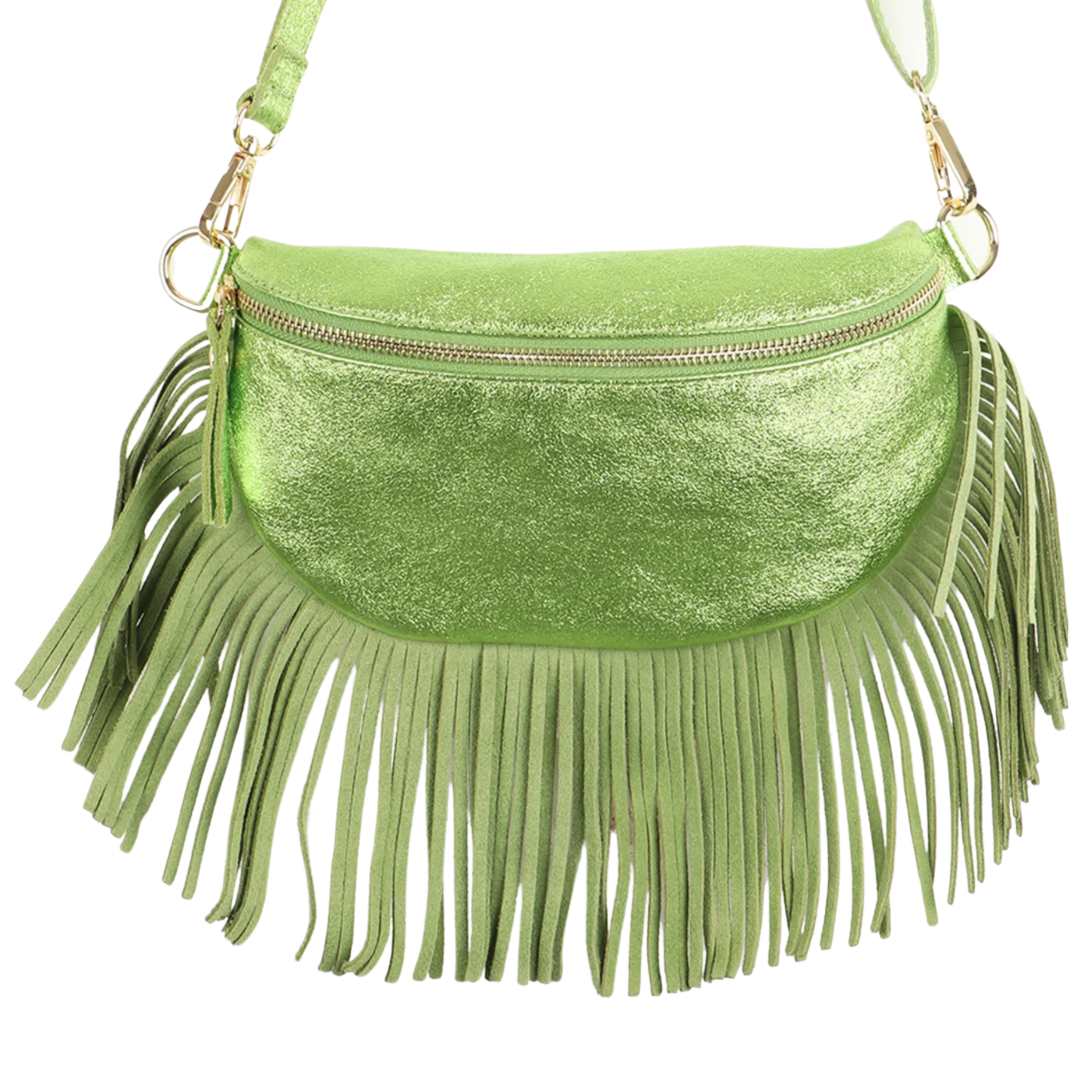 Sophia Lime Half Moon Leather Crossbody Bag With Fringe Trim